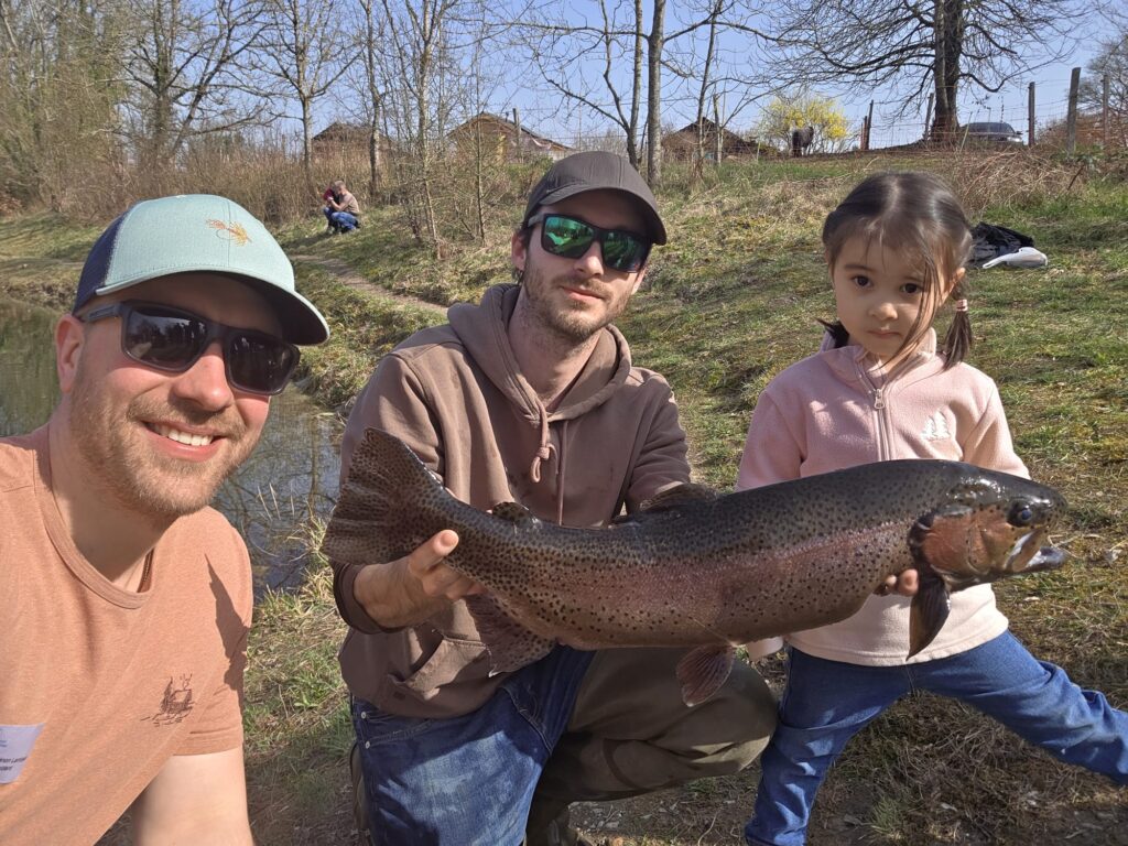 Zénon, Stéphane et Mathilde … et la « vedette » du jour, une truite arc-en-ciel de 67 cm